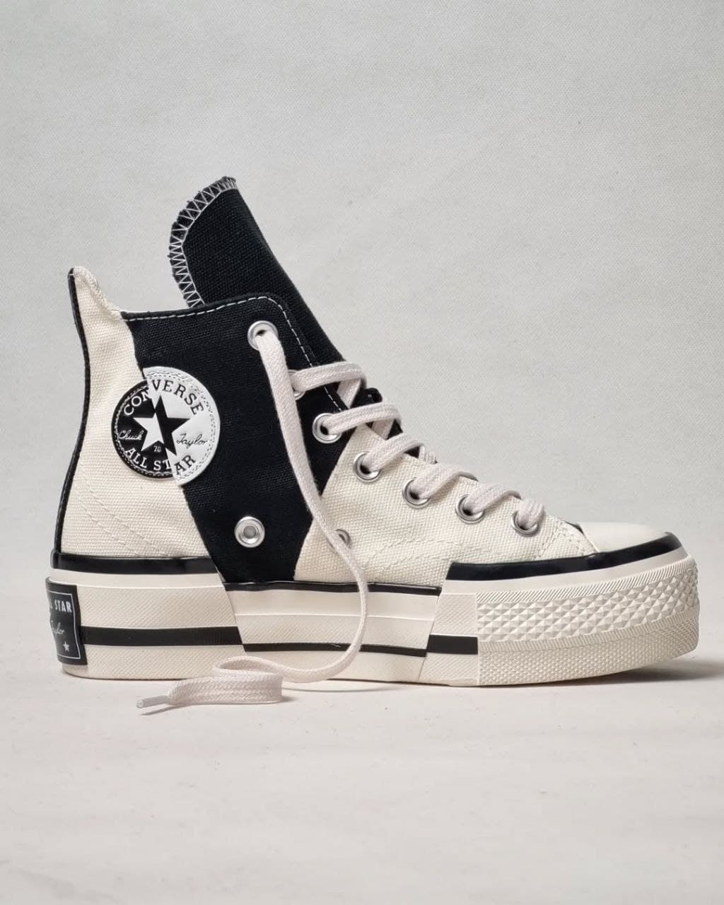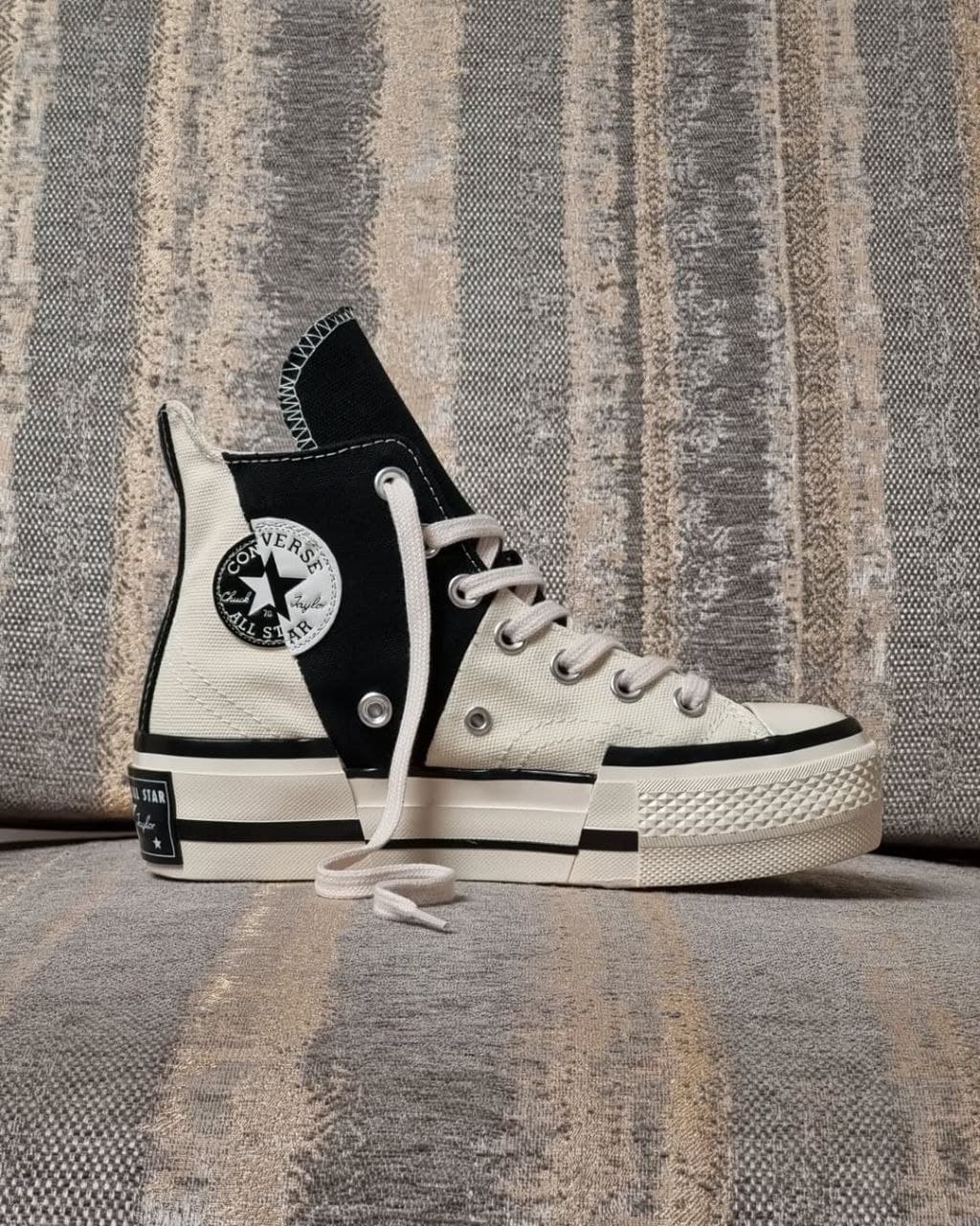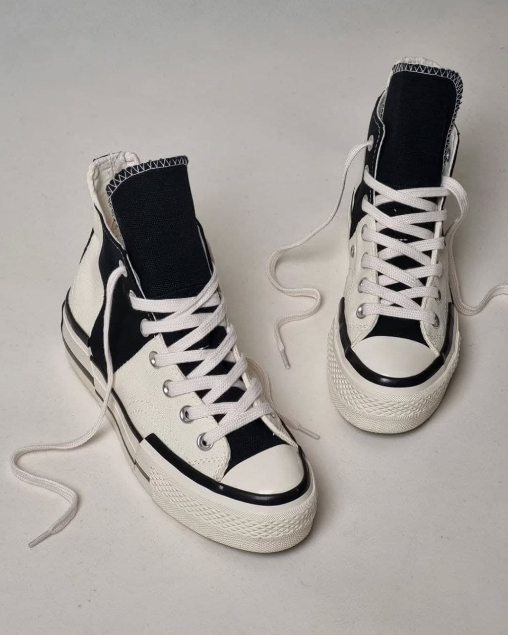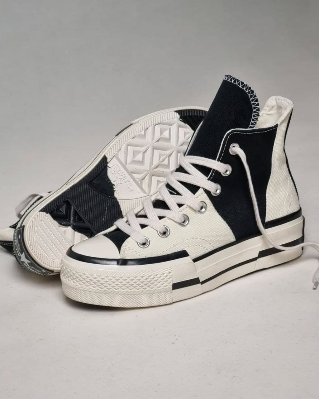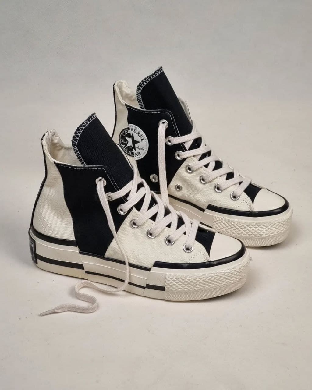 کفش کتانی کلاسیک با طراحی دو رنگ مشکی و سفید، ساختهشده از پارچه کنواس مقاوم و زیره لاستیکی وولکانیزه برای دوام بیشتر. دارای ساقبلند، بندهای سفید و جزئیات گرافیکی خاص روی کفی. مناسب استفاده روزمره با استایل کژوال.